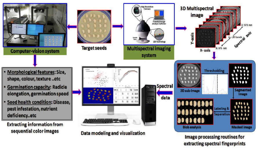 传统的检测方法有种子萌发测定、电导率测定、四氮唑法及计算机技术测定(高光谱、近 红外光谱和氧传感技术)。除计算机技术测定外,其他的方法均会对种子造成损伤,而且 耗费时间,准确性欠佳。多光谱成像技术优点:快速、无损丛晓翔将多光谱成像技术结合种苗评价的方法应用于不同品种的多年生黑麦草(Lolium perenne L.)种子活力预测中,试验结果显示,多年生黑麦草的归一化标准判别分析转换 图中的红蓝比例能够以较高的准确性预测出高、中、低活力的种子;平均光谱反射率图能 够区分开不同活力的种子以及较弱活力的死种子、新鲜未发芽种子和发育成不正常种苗的 种子;像素分布直方图的双峰性能够鉴别出死种子。