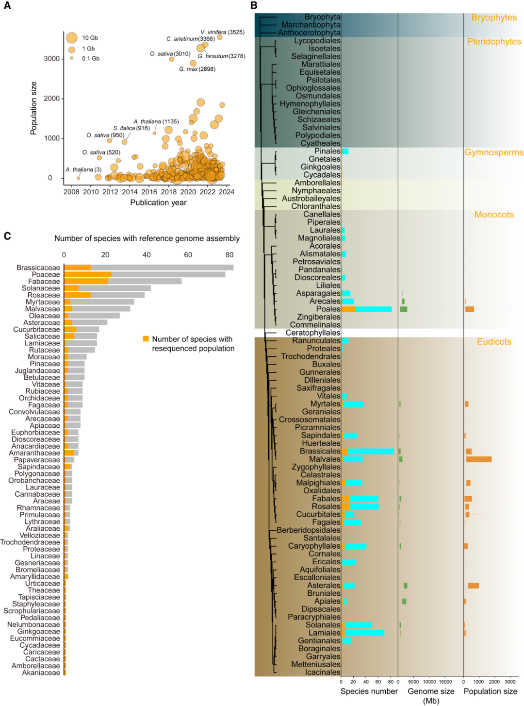 图1 | 重测序植物种群的时间进展和系统发育分布。(A)重新测序种群基因组规模变化。数据点大小反映对应物种的基因组大小。(B)植物种群重测序的系统基因组分布与综述。堆叠直方图描述具有参考基因组组装物种的累积情况,每个分类顺序的重测序物种数量用橙色条表示。随附的箱形图描述了重测序物种的基因组大小和种群大小的范围。(C)具有参考基因组组装的物种数量以及每个家族中具有重测序种群的物种的数量。每个科中重测序的物种数量用橙色条表示。