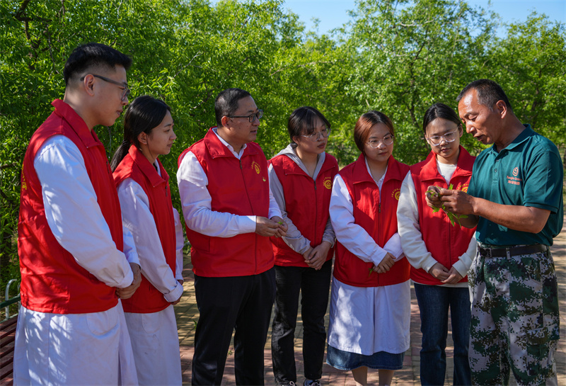 山东省乐陵市金丝小枣科技小院研究生们在枣林与枣农交流枣树栽培技术。