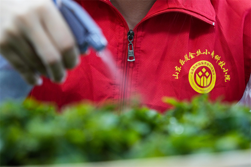 山东省乐陵市金丝小枣科技小院研究生在工作站给大叶枣芽做喷水实验。