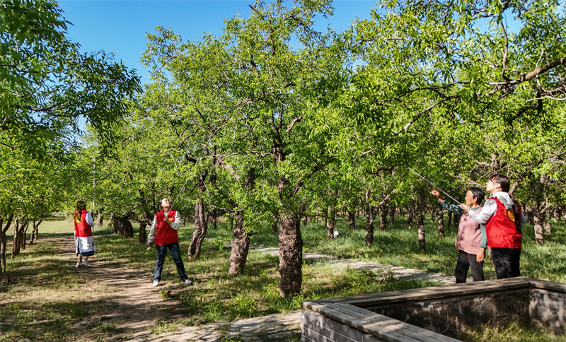 山东省乐陵市金丝小枣科技小院研究生们在枣林进行科学剪枝实践。