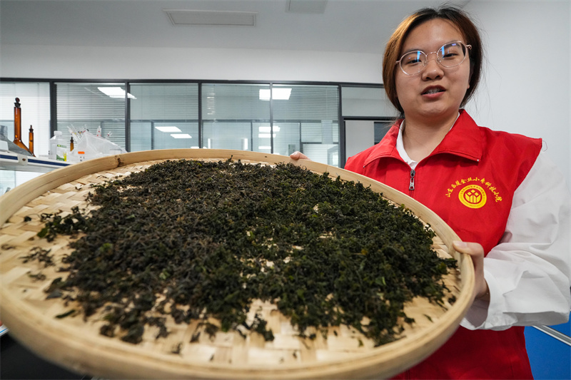 山东省乐陵市金丝小枣科技小院研究生在工作站展示新研制的黑化枣芽茶。