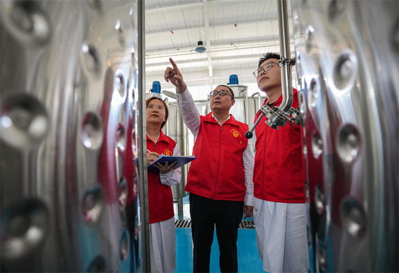 山东省乐陵市金丝小枣科技小院研究生在中试车间交流产品加工技术流程。