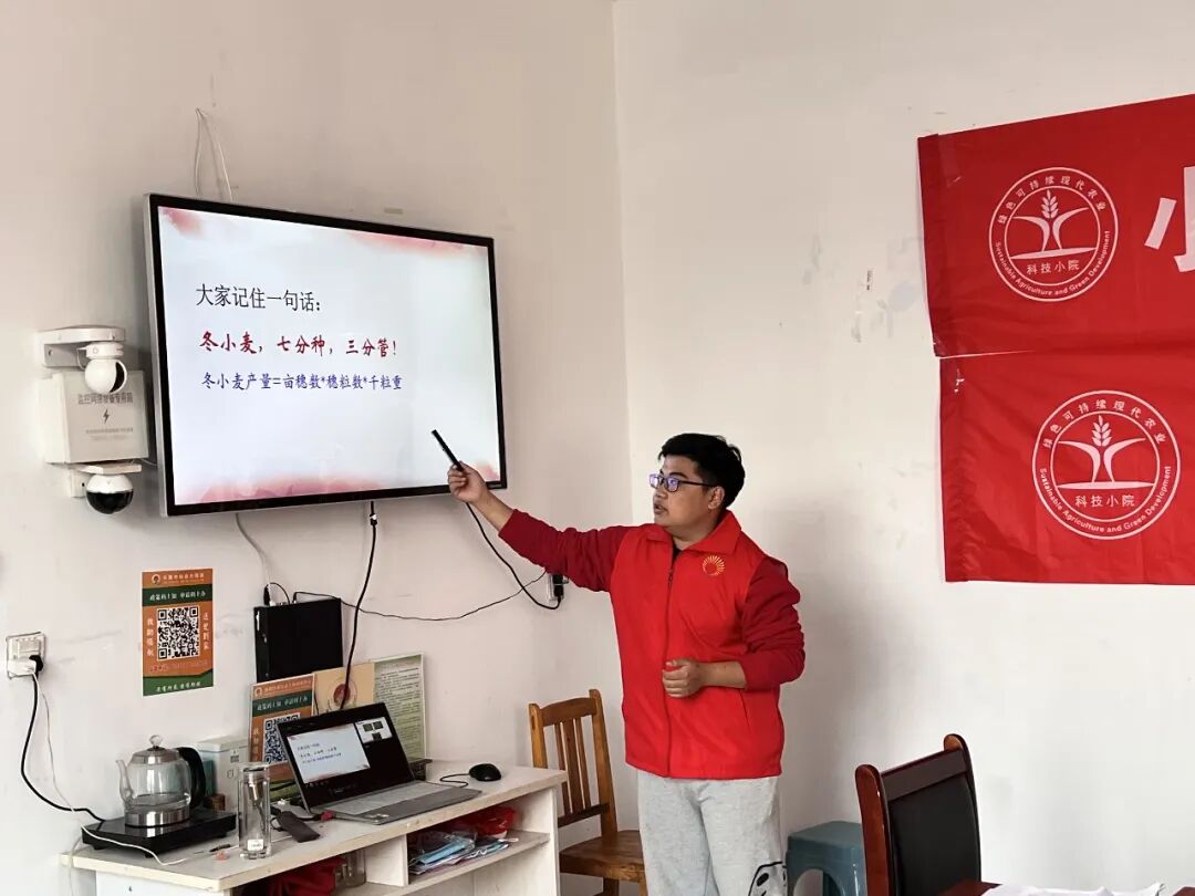 目前正值小麦播种的时期,青岛农业大学研究生周培福同学针对小麦播种前的整地、小麦播种的注意事项以及小麦冬季的田间管理三个方面为南夏村的农户开展冬小麦高产高效技术培训会。培训会上南夏村的村民热情高涨,并在会后提出了目前种植中存在的疑惑,小院学生为此进行一一解答。