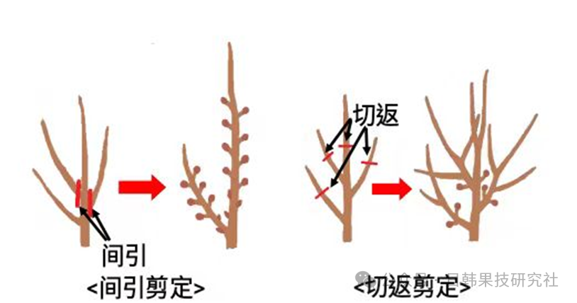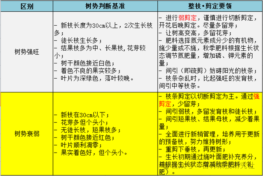 ① 如果降低向上生长得强旺的树木树高,就会使新枝(新梢)生长增强,花芽形成不良。② 树高较高的树木通过主干上部的作用抑制主枝生长。③ 如果保持主干的树心完整,树木整体的树势就会稳定下来了。④ 一般来说,越是小树,树往上长的特性就越强,长到一定程度后,才会使新枝(新梢)生长变弱,花芽形成良好。新枝(新梢)的生长受枝条从主干分开的角度(分枝角度)影响。① 分枝角度小的枝条越接近垂直,生长就越强,花芽形成就越差;分枝角度大的枝条越接近水平,生长就越受抑制,花芽形成就越多。② 树势不稳定引起势力强的枝条通过缠铝丝或诱引将分枝角度调到70度左右,诱导花芽的形成,树势就会稳定下来。