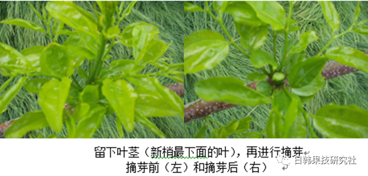 枣树的新梢生长期根据地区有所差异,但是一般从5月上旬到5月下旬开始展叶。从长出来的新芽来看,叶茎和嫩芽混合而生,中间胖乎乎的、带刺的芽会长成枝条,让树长高或延伸;在旁边细长的、不带刺的叶茎(叶轴)上会开花结枣。 长出新梢时,对幼苗的新梢生长枝进行引诱,有利于塑造树形。对成年树分3~4次进行摘芽。对于2年生的幼苗,请不要摘芽,徒长枝长得茂盛,就让它生长,有利7月培养枝条。 摘芽的理由是让流向树枝的营养成分朝有花芽的枝干移动,从而提高授粉率。最好尽快进行摘芽。 摘芽的目的是去除徒长枝,促进花芽饱满,从而提高授精率,最后提高生产量。 在不去除徒长枝的情况下,结实会变得不好。徒长枝在开花前去除,而当作第二年结果枝的徒长枝要继续留着,所以长出1~2根枝条就进行摘芽。根据树龄的不同而会有所差异,但是最好留下4~5根叶茎,再把徒长枝全部去除。 摘芽的最佳时间从发芽后开始,提前进行摘芽有利于提高产量,6月上旬开花前完成。 摘芽的方法: a) 在去除枝条中间的新芽时,留下叶茎(新梢最下面的叶),再进行摘芽。