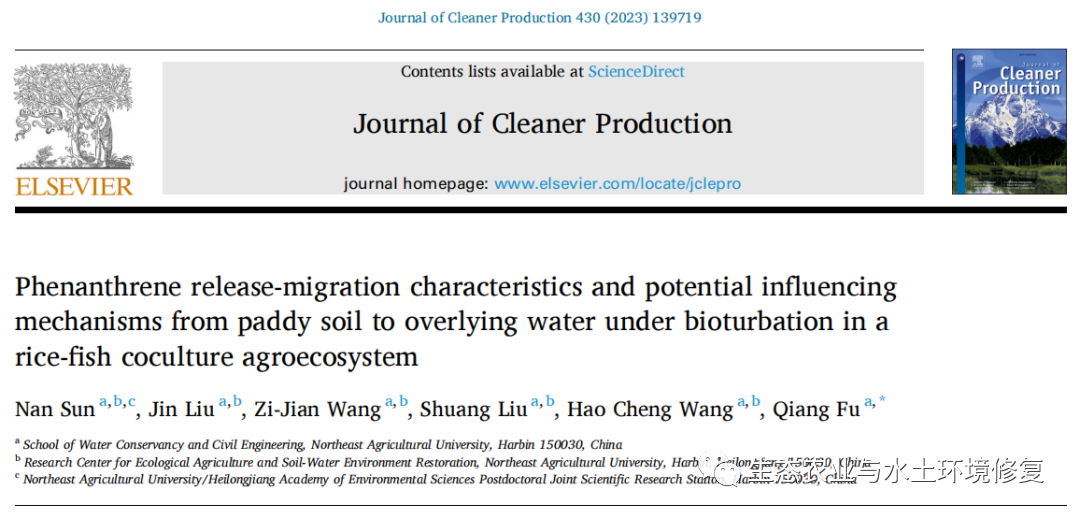 原名:Phenanthrene release-migration characteristics and potential influencing mechanisms from paddy soil to overlying water under bioturbation in a rice-fish coculture agroecosystem 译名:稻渔共作农业生态系统中生物扰动作用对底泥菲向上覆水释放-迁移特征和潜在影响机制 期刊:Journal of Cleaner Production 2022年影响因子:11.8 5年影响因子:11 在线发表时间:2023.11.15 通讯作者:付强 第一单位:东北农业大学水利与土木工程学院 生物扰动作用促进了菲向上覆水体的释放; 菲的吸附-分布模型取决于生物溶解性有机质浓度; 紫外-荧光示踪技术揭示了菲的迁移途径; 粒径是影响菲迁移的主要因素;